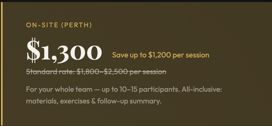 Be among the first Perth-based teams to experience AZ Leadership Advisory's customised corporate training at a reduced pilot rate. In exchange, we ask for your honest feedback and an optional testimonial.